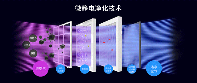 平板静电是第二代静电净化技术,微静电是第三代静电净化技术。微静电通过密集静电矩阵电场,极大的提高了吸附效果。